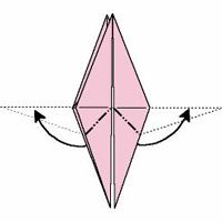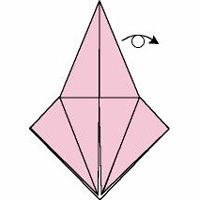 比例:1:1正方形紙 運用的記號:山摺線、谷摺線、沿箭頭方向摺、摺到後方、向內從中摺、向外反摺、翻轉、押入 學習的摺法:打開袋子壓平 |