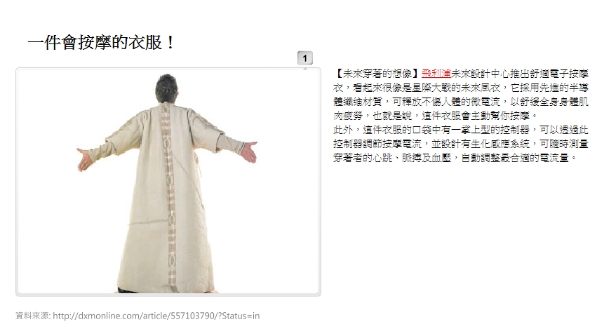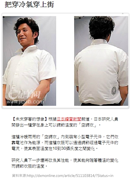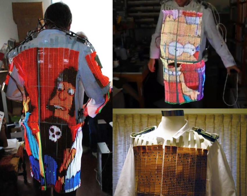 coat」的裝置,是一件可以穿著的「LED電視裝」,外套上頭佈滿LED燈泡,能夠直接播放iPod或DVD播放器的影片,讓你把喜愛的影集、電影全都「穿上身」,活脫脫就是個活動電子看板,整個超威風。LED電視裝是由12伏特的電池為電力,充電一次能夠維持1小時的播放。資料來源:http://daman.cool3c.com/node/48605