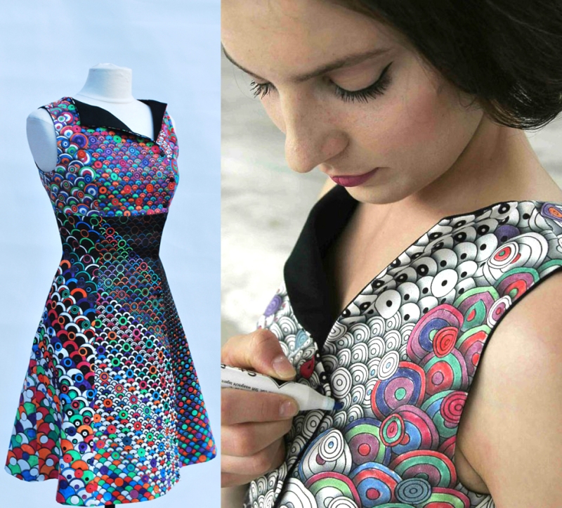 聯手推出了一件非常女性化又成人向的著色畫,把著色的概念結合時裝,直接變成著色洋裝!一開始是一件純黑白的圖騰洋裝,利用附上的彩色筆,就可以在搭車、等人、等餐、等下班之類瑣碎的時間把洋裝塗上各樣色彩,隨著著色的動作,洋裝會呈現不同的面貌