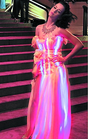 Dress(銀河系晚禮服)走紅毯,這款內置LED燈的會發光的裙子讓凱蒂艷光四射,明艷照人。
