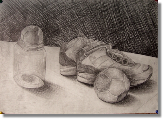 球鞋的大塊面要以淡調來畫,因為鞋是白色的,水壺的透明感用軟擦擦拭出表現反光球的塊面分為多種顏色,要由最深色塊下筆,再順淺色著,但背光面仍需加重色調,迎光面仍可以用軟擦使其色調變淡些。
